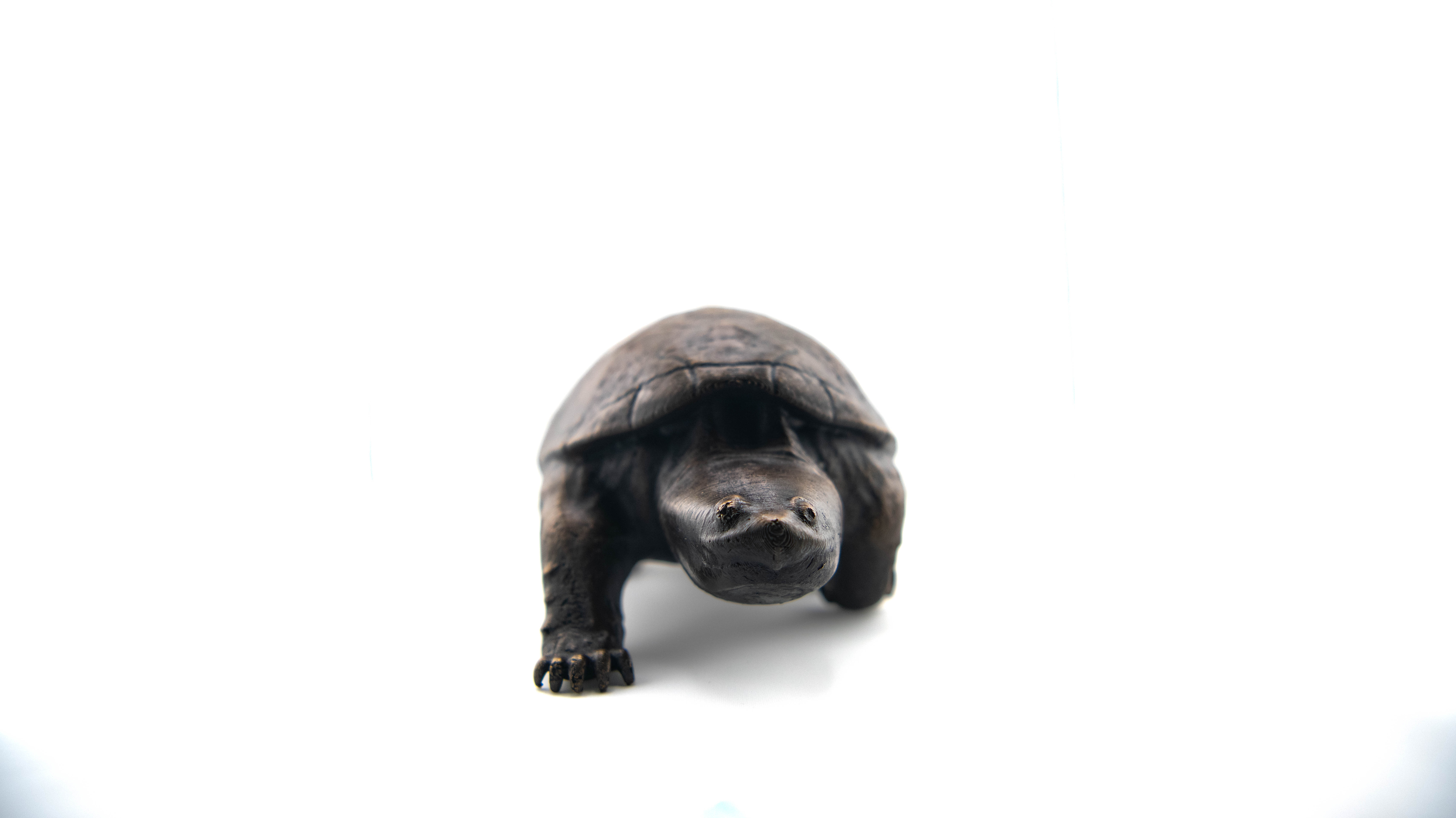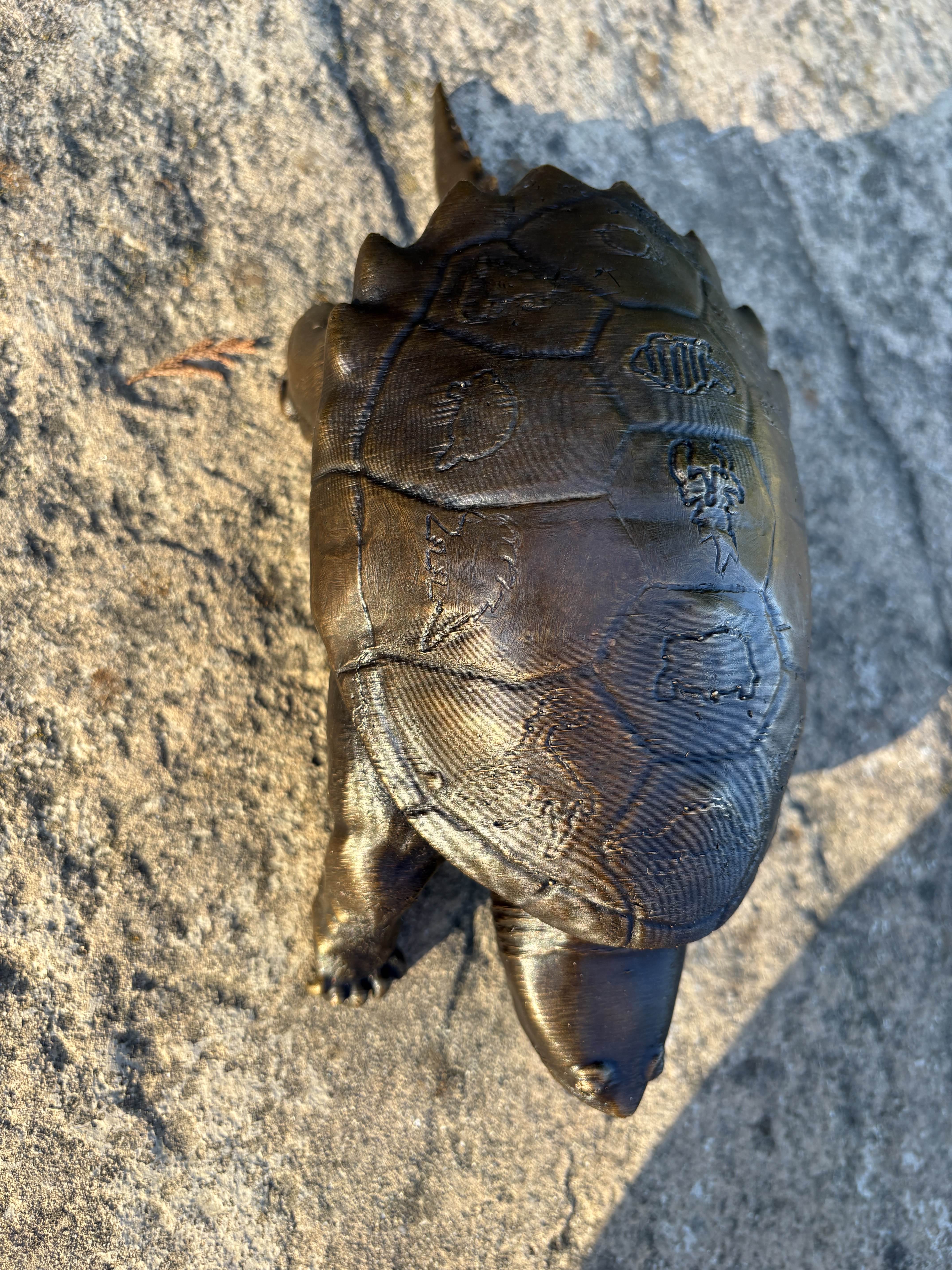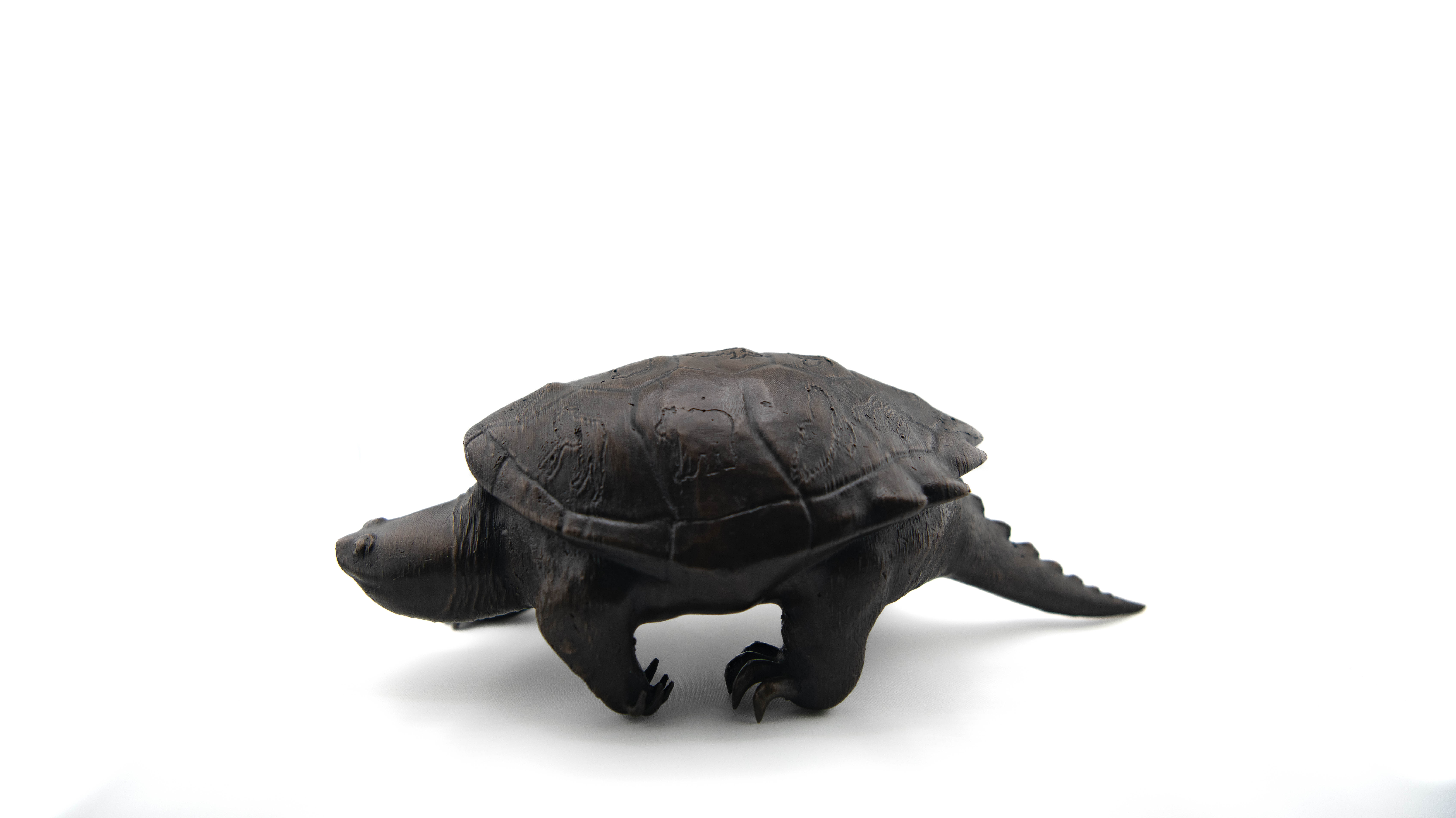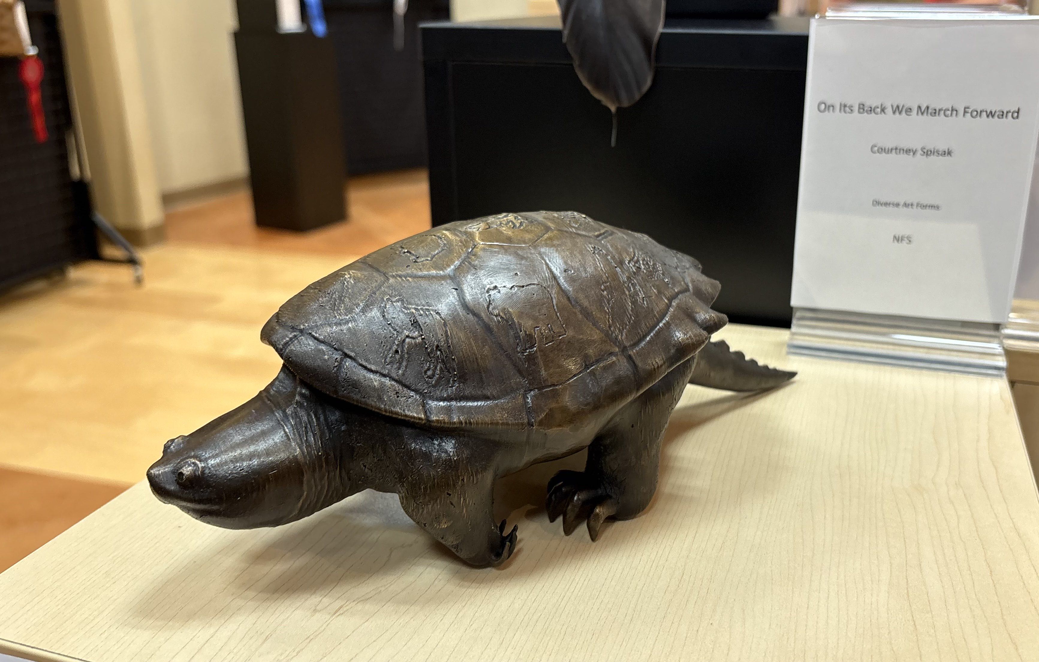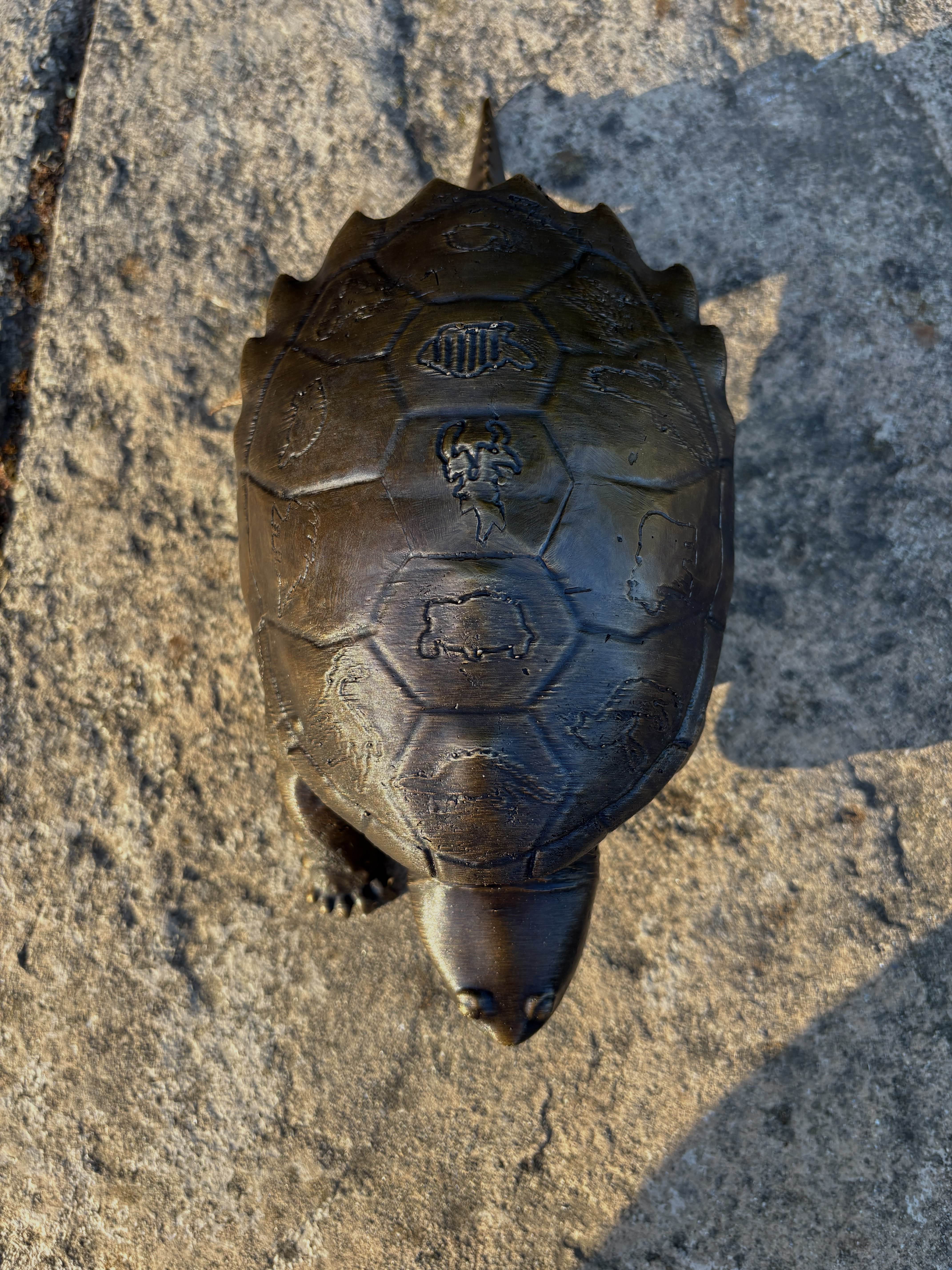 On Its Back We March Forward is a bronze sculpture of a snapping turtle. In this piece, I aimed to create a sculptural representation of the symbol and resilience of the Wyandotte Nation. I chose to model the snapping turtle walking because I wanted to represent the passage of time in the world and the progress of the Wyandotte Nation. Despite the adversities faced in the past, the Nation still stands strong and moves forward. The twelve different clans are etched on the shell of the turtle, as well as the council fire, which sits in the most center part of the shell, keeping watch and providing guidance over each of the clans. During the process of making this sculpture, it was transferred between several different media. I wanted to explore the process of making a digital art piece into a tangible object. This piece originally started as a digital 3D model made in Blender. Beginning as a cube, I added geometry and modeled it into the turtle utilizing low-poly modeling and high-poly sculpting. When I had a 3D model that I was happy with, it was 3D printed using PLA filament in two parts: the front half and the back half. This model was then gated in wax, and a plaster mold was made from it. Then bronze was poured into the mold. The final finishing process included welding the two parts of the turtle together, cleaning up the weld, reetching any lost details, cleaning up the gates, and sandblasting. The final reddish brown color is made from a patina consisting of Blackner and Ferric Nitrate. After the patina was applied, the sculpture was waxed and buffed. This piece was a part of the Wyandotte Nation 2025 Artisan Showcase under the category of Diverse Artform.